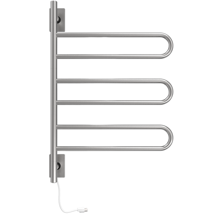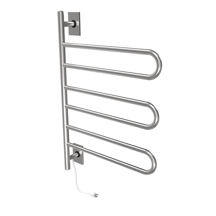 Introducing the Amba Products SL3-B Swivel 3-Loop Bars Hardwired & Plug-in Combo Towel Warmer - x x in. - Brushed Finish. The unique design of the Swivel collection is ideal for small spaces. Each bar rotates independently on these models. Whether it’s in a bathroom or laundry room, the small footprint means it can be installed in tight spaces. Offered in three beautiful finishes – brushed, matte black, and polished – you’ll never have to worry about it chipping or rusting.